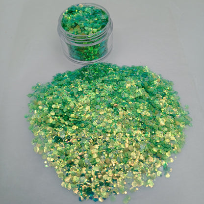 - Design: Holographic mint green glitter in assorted hex shapes