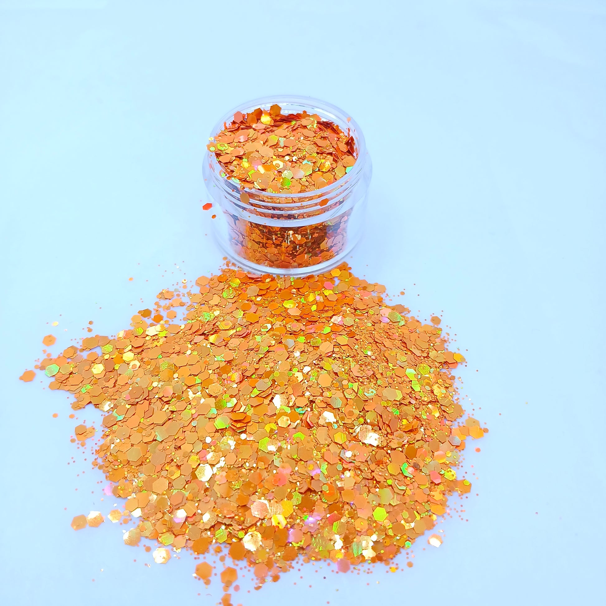 - Design: Chunky mix of hexagon cuts in a fiery orange tone with UV-reactive properties