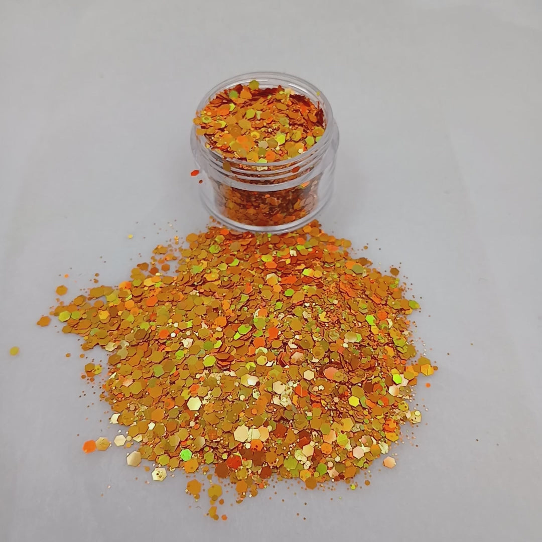 Sunburnt is a vibrant UV-reactive glitter that brings a fiery personality to your projects. Indoors, it shows off a bright golden-orange base, but once exposed to sunlight or UV light, it transforms into a bolder, burnt orange glow. With its bold holographic flakes and smooth shift, this glitter adds dramatic color play and dynamic energy to your resin art, tumblers, nail sets, and more.